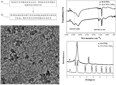 摘要:本发明公开了一种可重复使用的碳基纳米破乳剂及其制备方法。该制备方法包括:碳纳米管与混酸溶液发生反应,得到表面含有羟基和羧基的氧化碳纳米管;将有机钛前驱体水解产生的纳米TiO2接枝到氧化碳纳米管表面,得到可重复使用的碳基纳米破乳剂。本发明还公开了由上述制备方法得到的破乳剂。本发明提供的破乳剂制备方法简单、绿色环保,该破乳剂在常温条件可对稳定的含油废水进行快速破乳,尤其是对含油量为1%的含油废水,具有良好的破乳效果,水相清澈,且能回收再次使用