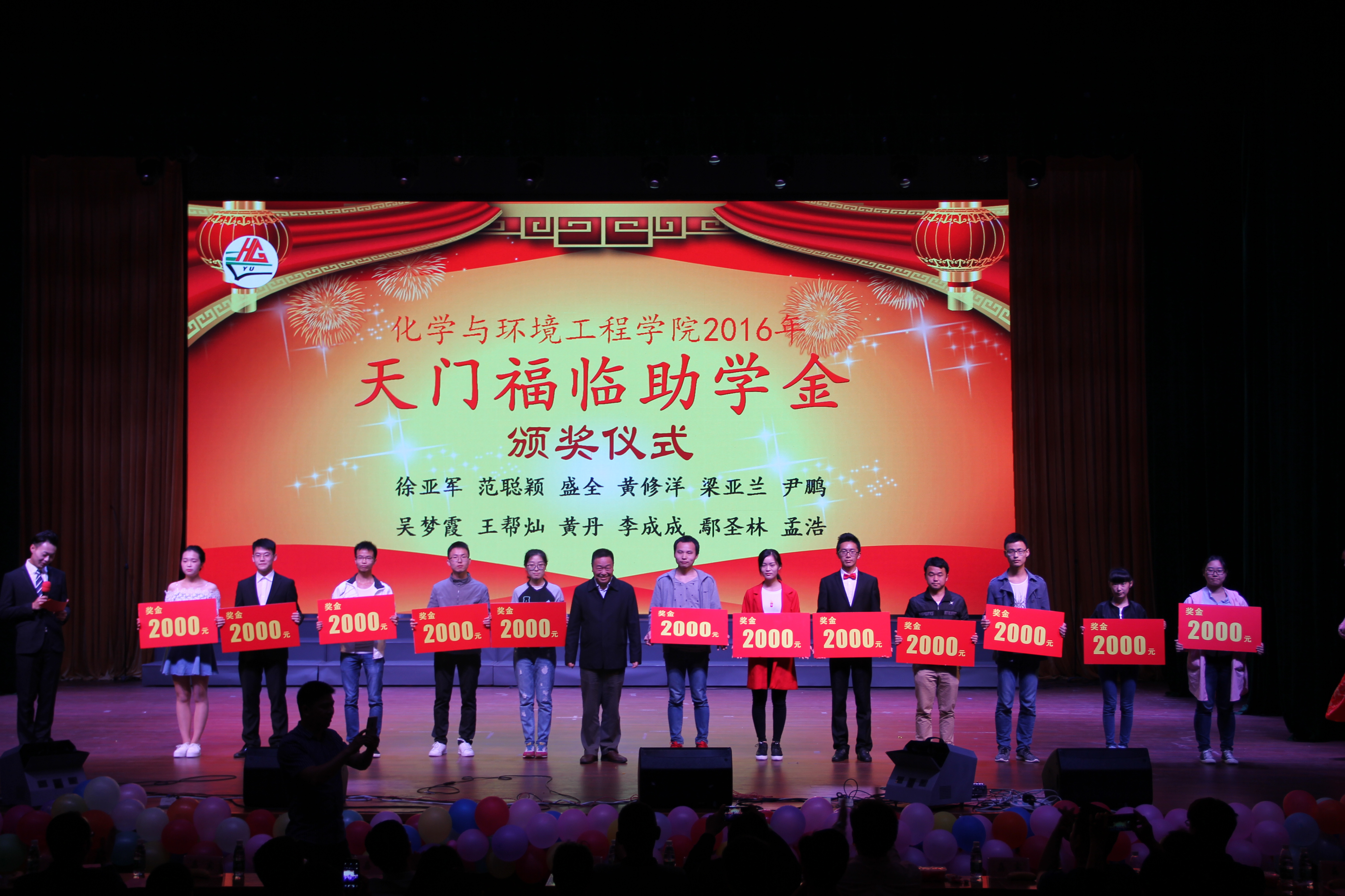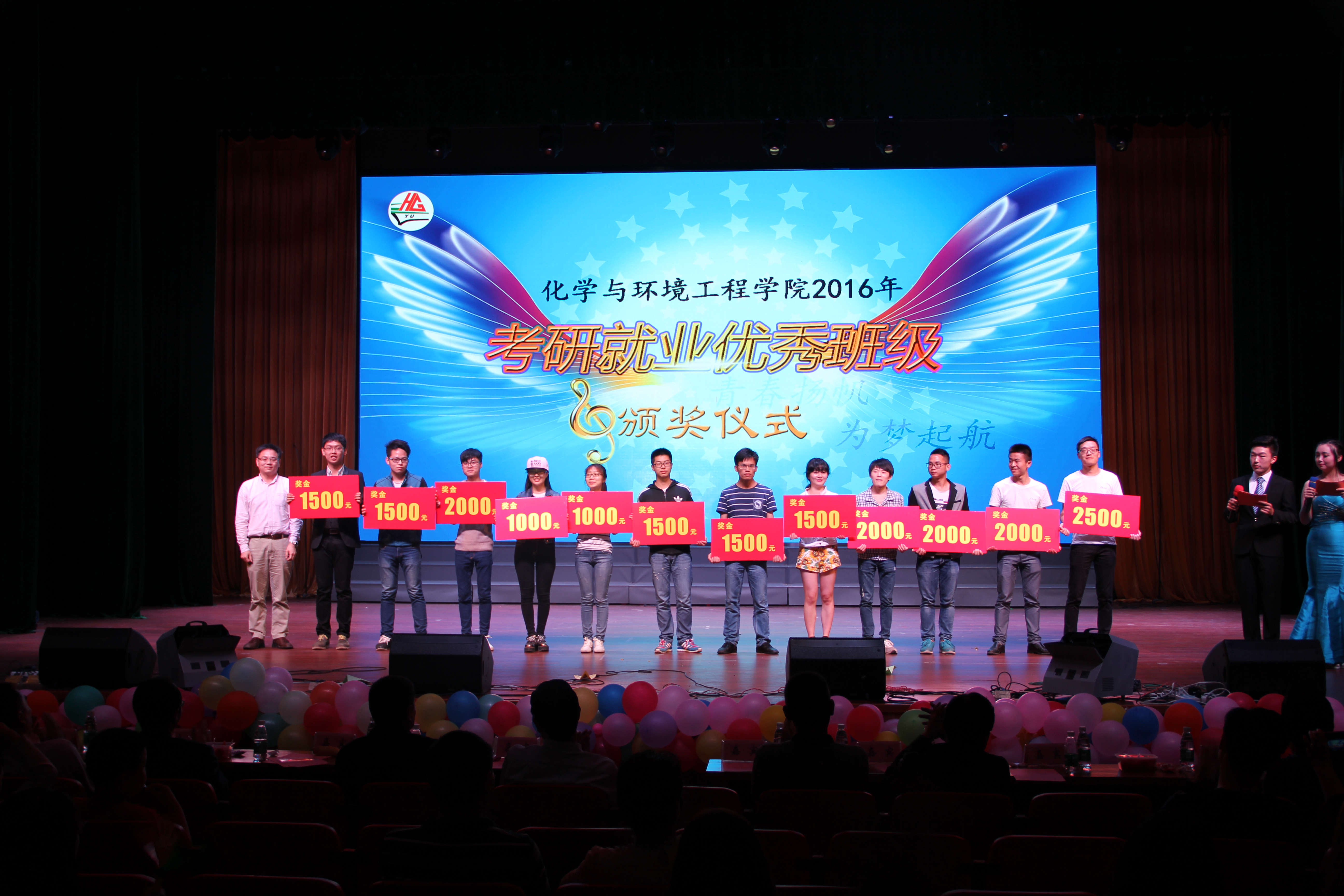 在晚会现场同时穿插进行了“学院第五届十佳大学生颁奖”、“学院2016年天门福临助学金颁奖”、“学院2016年考研就业优秀班级颁奖”、也为英勇救人团体和征战“清晓杯”荣获亚军的团体颁发了奖状和奖金。