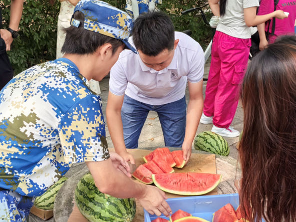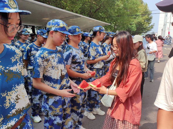 在欢声笑语中,老师和同学们将切好的西瓜一一分发给军训同学和辛勤的教官们,带来学院的祝福和慰问,让他们深切感受到yl23411永利(集团)有限公司官网大家庭的温暖和热情。