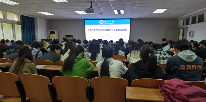 讲解结束后,现场学生针对水系锌离子电池正极材料的改性及柔性应用的领域与前景提问。王老师解答道,其具备的诸多优势使其在可再生能源、智能电网、电动交通和便携式设备等领域拥有广阔应用前景。随着科技进步与研究深入,水系锌离子电池性能将持续提升,应用领域也会不断拓展。