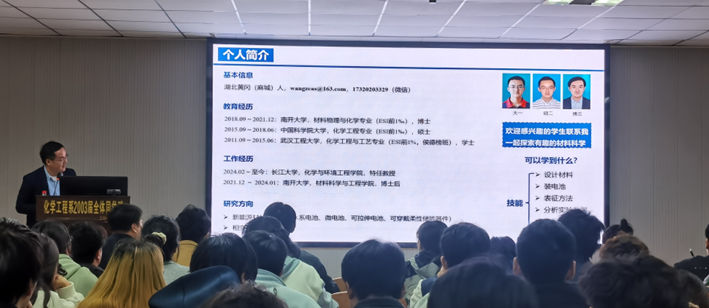 讲座由主题讲解与师生问答两部分组成。开场时,赖璐副院长向大家简要介绍了主讲人王昭老师。王昭老师来自湖北麻城,是中共党员,2021年毕业于南开大学材料物理与化学专业并取得博士学位,随后在南开大学从事博士后研究至2024年2月,同年受聘长江大学“学科菁英人才(特任教授)”岗位,主要从事新能源材料与器件(水系电池、微电池、可拉伸电池、可穿戴柔性储能器件)以及相变储能材料的研究工作。