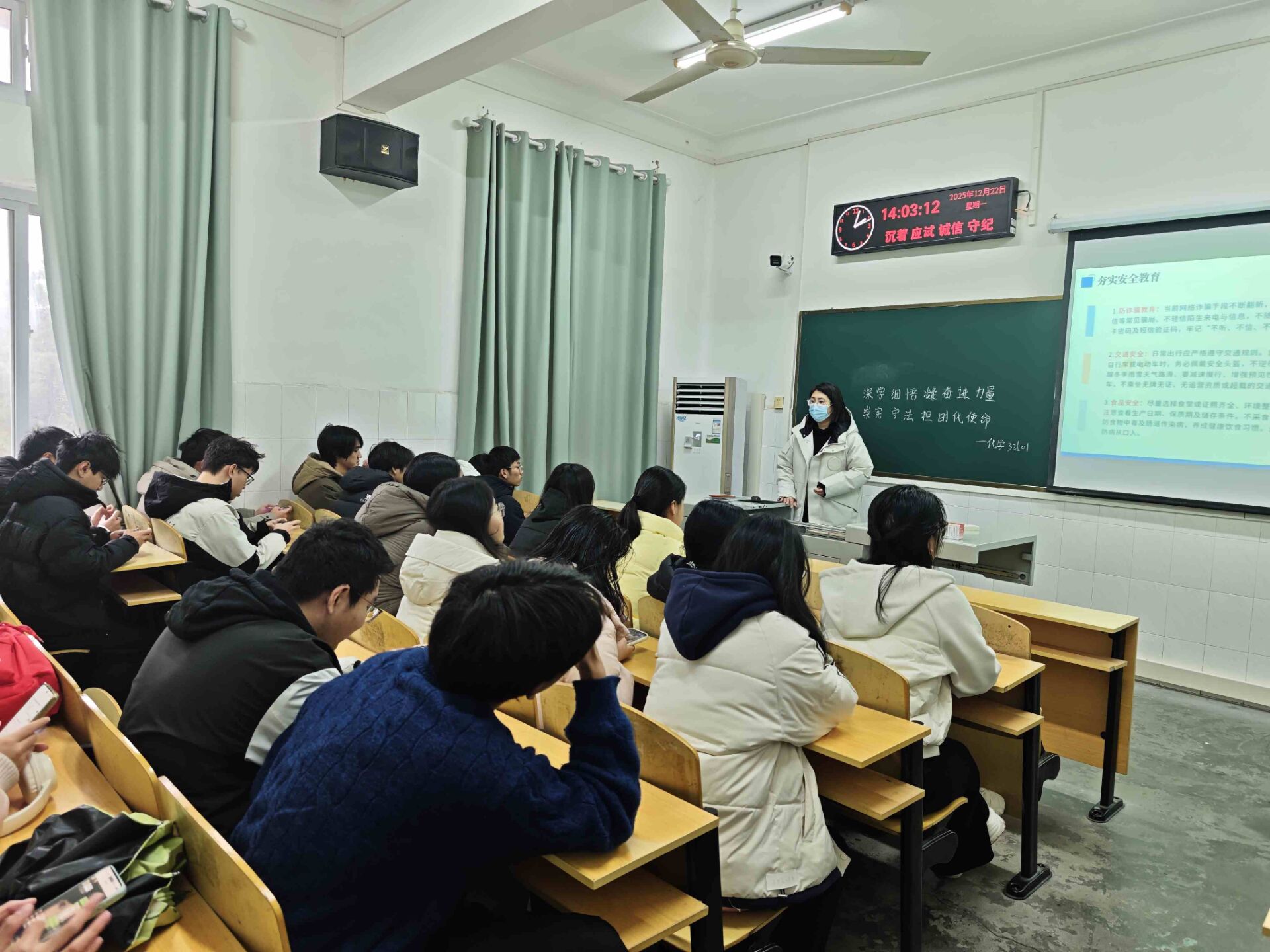 各班班会紧扣假期安全核心要点,围绕"夯实基础安全、严守专项规定、远离高危风险"展开系统宣讲。在基础安全教育环节,各班重点聚焦防诈骗、交通、食品、财产、人身及消防安全六大领域。通过剖析近期刷单返利、冒充客服、虚假征信等典型诈骗案例,重申"不听、不信、不转账"的防骗铁律,提醒学生严守个人银行卡密码、短信验证码等隐私信息;结合冬季雨雪天气特点,强调出行遵守交通规则,步行不低头看手机,骑行电动车佩戴安全头盔,拒绝无牌无证、超载等非法交通工具;倡导选择食堂或证照齐全的餐饮单位就餐,远离"三无"食品和不明野生植物,从源头防范食物中毒;同时叮嘱学生妥善保管贵重物品,离开宿舍及时锁门,公共场所不随意放置随身物品,深夜不单独前往偏僻区域,熟练掌握灭火器"一提、二拔、三握、四压"操作方法及火场逃生技能。