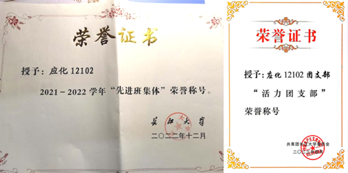 团支部成员获“优秀共青团员”“优秀学生干部”“三好学生标兵”等荣誉10余人次;获国家励志奖学金、长江大学奖学金、中国石油奖学金等10余人次;获化学(化工)创新成果报告会、数学竞赛、化学实验技能大赛等竞赛奖项20余次;参与发表英文和中文核心论文发表7人,申请专利2人,参与国家自然科学基金青年项目、校级和院级大创项目等科创项目10余人。