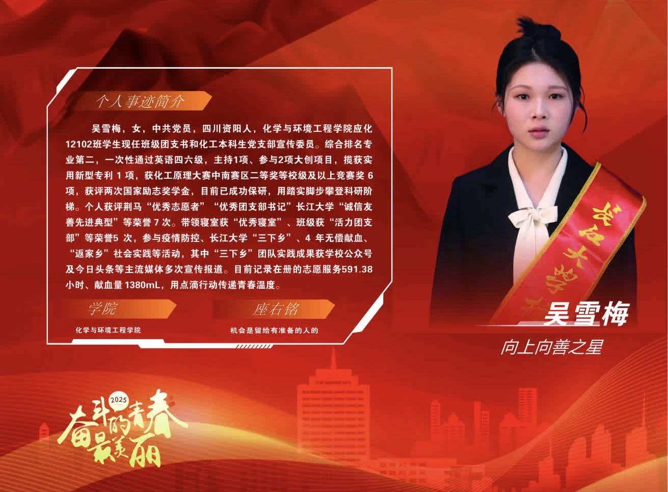 【个人简介】吴雪梅,女,汉族,中共党员,四川资阳人,长江大学yl23411永利(集团)有限公司官网应化12102班学生。现任班级团支部书记和化工本科生党支部宣传委员。