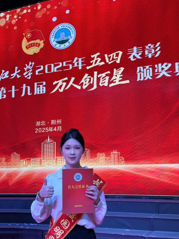 根系乡土,反哺桑梓情深。假期永远是她的“公益档期”。随长江大学暑期“三下乡”团队深入洪湖乡村,获中国网等主流媒体报道;在安岳县寒假“返家乡”实践中,她积极宣传电瓶车充电安全事项,检查“九小场所”消防安全;作为荆州火车站“五一”假期志愿者组长,她带领的小组圆满完成任务并获得负责人表扬和感谢。因表现突出,相继获评长江大学“诚信友善先进典型”、荆州马拉松“优秀志愿者”、第十九届“万人创百星”“向上向善之星”称号。