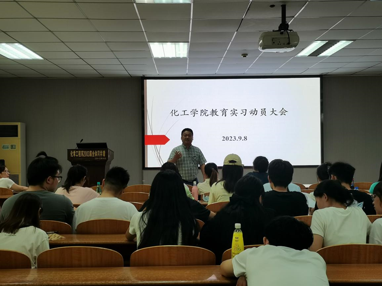 化学系主任舒文明老师嘱咐同学们要合理安排时间,平衡好毕业实习、考研与找工作等关系。实习指导老师童金强介绍了教育实习的基本要求和注意事项,指明整个实习过程中指导教师和学生各自的职责。他强调同学们要听从引导,实习期间注意人身安全、财产安全。副主任刘华荣对本次教育实习提出细致要求,强调必须规范填写实习手册,提交有质量的教育研究报告。