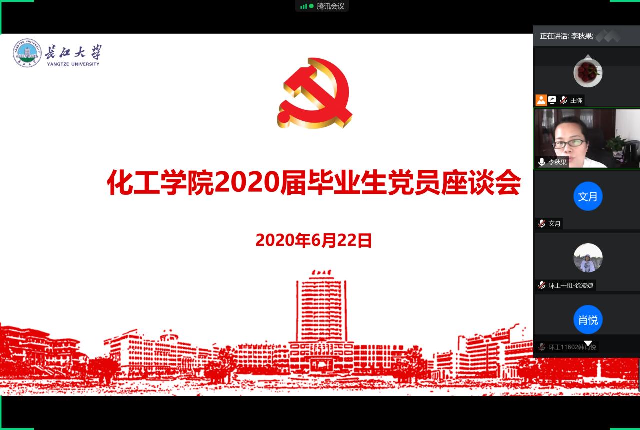 (通讯员 郭先哲 王陈)“不忘铮铮誓言,牢记初心使命”, 6月22日下午,yl23411永利(集团)有限公司官网党委于腾讯会议召开2020届毕业生党员线上座谈会。学院党委书记刘桂生,副书记李秋果,党委委员、副院长黄河,党委委员、化工系主任石东坡,全体学生党支部书记及47名毕业生党员参加座谈。yl23411永利(集团)有限公司官网党委副书记、本科生第一党支部书记李秋果同志主持会议。