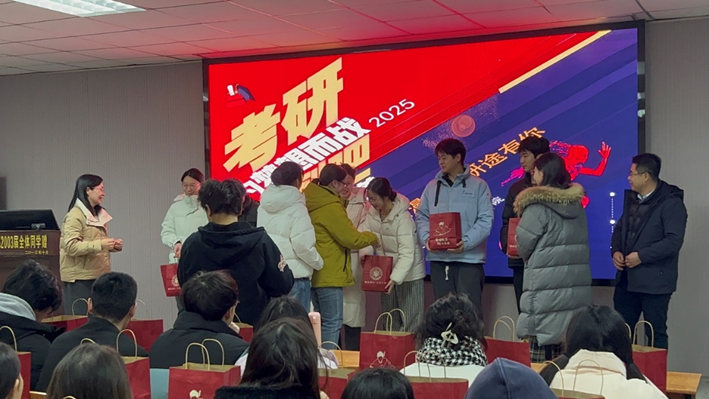 最后,王书记、杨书记和在场的老师们为考研学生代表赠送爱心大礼包,悉心筹备的考研关怀礼包,承载着学院与师长们满满的祝愿,为考研路上的学子们提供温暖的力量。愿他们目光坚定、信心满怀,最终梦想成真,一战成硕。