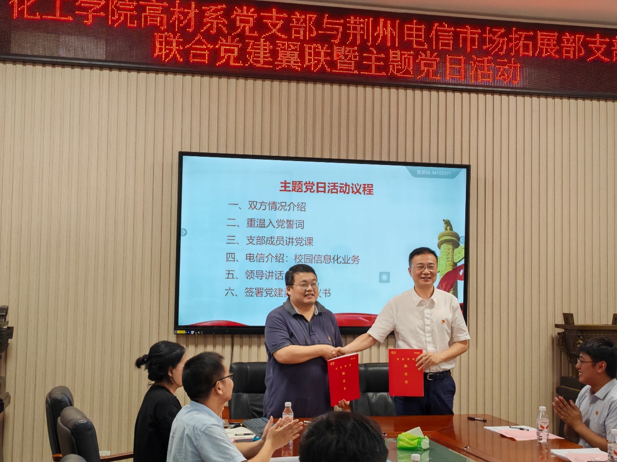 5月22日下午,湖北省高校“双带头人”教师党支部--长江大学yl23411永利(集团)有限公司官网高分子材料与工程系党支部与中国电信荆州分公司市场拓展部党支部联合举行党建翼联主题党日活动,通过组织共建推动党建与业务双融双促。双方党支部书记肖围、杜海和21名党员出席活动。活动由湖北省高校“双带头人”教师党支部副书记李传华主持。 活动通过"四个一"环节展开深度交流:组织共建环节,双方通过支部互相介绍加深了对彼此组织建设、业务特色和党建成果的系统认知;思想共学环节,全体党员面向党旗庄严宣誓,以重温入党誓词强化党性修养;专题共研环节,湖北省高校“双带头人”教师党支部宣传委员张春燕同志作《坚持自立自强 突出应用导向 推动人工智能健康有序发展》专题党课,通过剖析AI技术前沿动态与产业应用场景,激发党员立足专业岗位推进科技创新的使命感;业务共促环节,荆州电信市场拓展部党支部王子徽系统展示了中国电信教育信息化解决方案,重点解析了5G+智慧校园、教育大数据平台等数字化实践成果,并结合荆州电信与长江大学实施案例进行了分析解读。 双方支部书记在总结讲话中指出,此次联建开创了校企党组织"理论联学、资源联享、发展联促"的新模式,后续将建立"组织联建、活动联办、人才联育"的常态化机制,切实把党的政治优势转化为发展动能。活动最后,双方正式签署《党建翼联合作协议》,约定通过定期开展技术研讨、项目合作、人才交流等多元化共建形式,共同探索"党建+业务"融合发展的创新路径。 此次共建活动既包含理论武装的思想淬炼,又注重实践层面的业务对接,通过搭建校企协同创新平台,为教育信息化建设与新材料研发应用领域的深度合作奠定了坚实基础。同时也是全国高校“双带头人”教师党支部书记“强国行”专项行动走深走实的重要环节。 (审核:肖围;编辑:王志权)