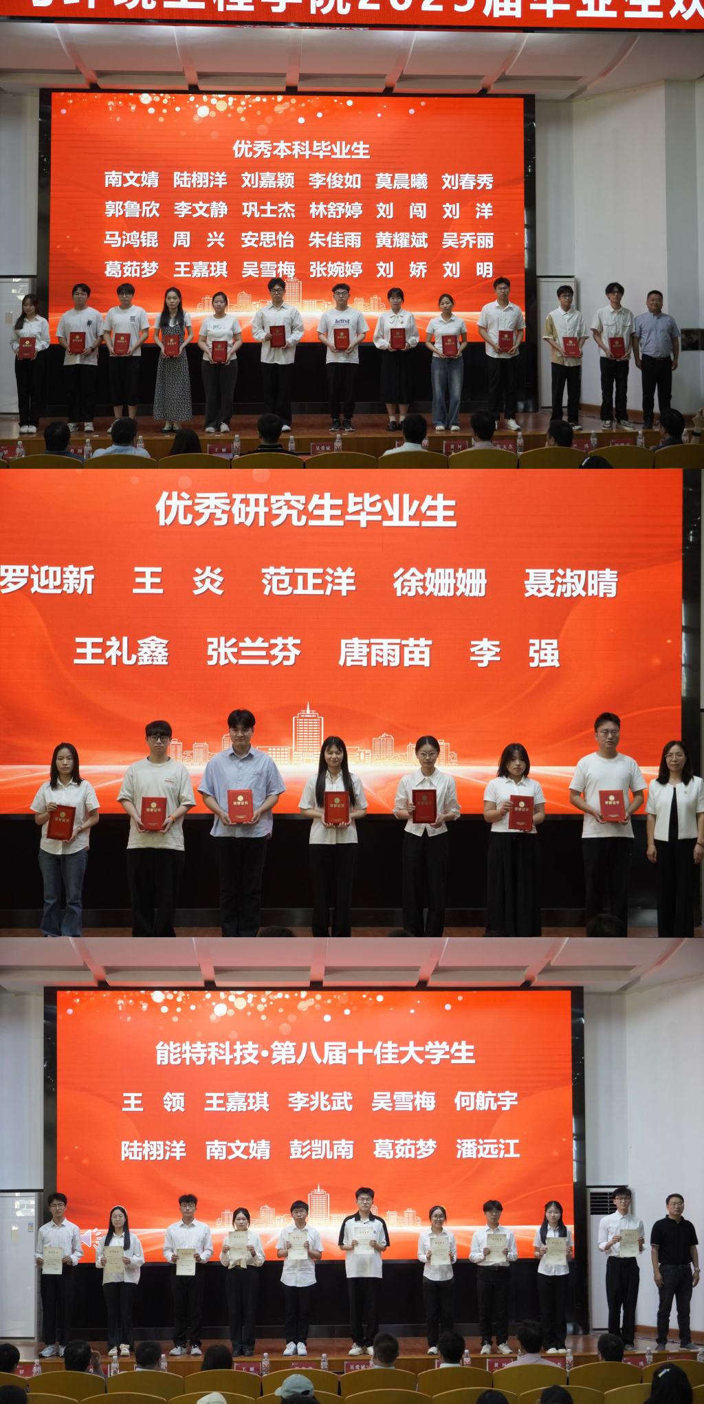 大会在热烈的氛围中拉开帷幕。主持人21级辅导员王娜以真挚的话语,向圆满完成学业的毕业生送上“毕业快乐”的美好祝福,现场掌声雷动。表彰环节中,学院对在学业、科研、实践等领域表现优异的个人与集体进行了表彰。2025届毕业生以笔为刃、以梦为马,共有136名本科生、8名研究生成功考入清华大学、南京大学等高等学府继续深造读硕读博,吴雪梅等21位同学作为考研优秀个人上台领奖;高材12102、化工12101等6个班级以及23栋A404等3个寝室,以卓越的团队协作精神脱颖而出,荣获考研先进班集体和考研优秀寝室荣誉称号;邓智豪、焦珂宣等19位学生,代表2025届57名优秀毕业生上台领奖,他们在校期间努力学习,全面发展,以青春之笔,书写了拼搏奋进的壮丽篇章;最后压轴登台的是荣获yl23411永利(集团)有限公司官网“能特科技·第八届十佳大学生”称号的10位同学,能特科技董事长张光忠先生亲自为他们颁奖。每一个奖项的宣读,都伴随着热烈的掌声与欢呼声,彰显着化工学子的风采与荣耀。