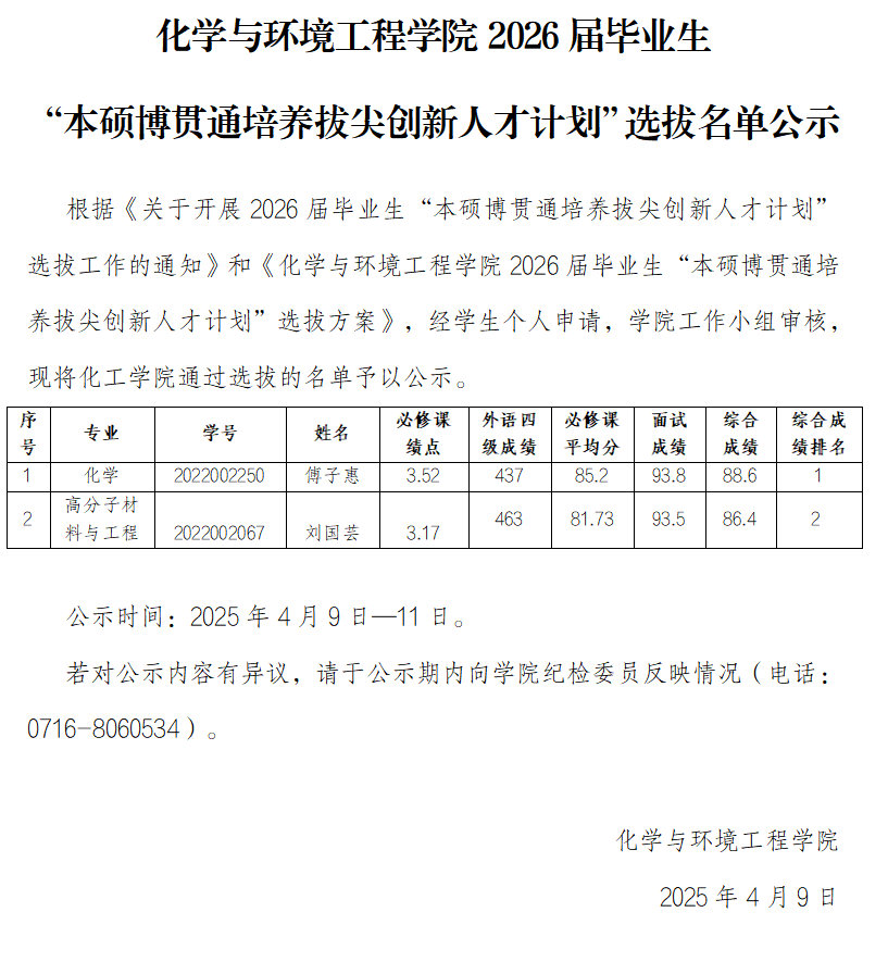 yl23411永利(集团)有限公司官网2026届毕业生“本硕博贯通培养拔尖创新人才计划”选拔名单公示