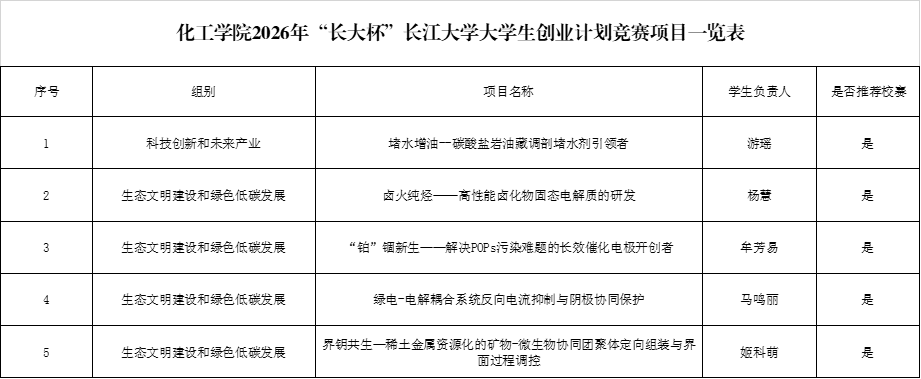 按照《关于举办2026年“长大杯”长江大学大学生创业计划竞赛暨“挑战杯”中国大学生创业计划竞赛校内选拔赛的通知》的要求,经过学生提交申请、学院答辩评审,拟推荐《堵水增油--碳酸盐岩油藏调剖堵水剂引领者》等5个项目申报校级挑战杯,具体名单如下。