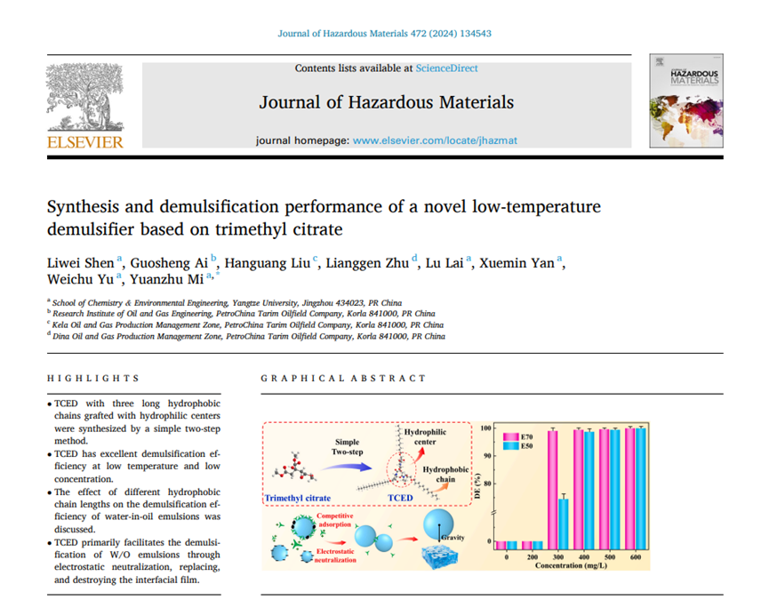 最近,《Journal of Hazardous Materials》(IF=13.6)发表了yl23411永利(集团)有限公司官网米远祝教授课题组的最新研究成果,报道了一种低温原油破乳剂的制备。论文题目为“Synthesis and demulsification performance of a novel low-temperature demulsifier based on trimethyl citrate”,硕士研究生申利伟为论文第一作者,米远祝教授为论文通讯作者。