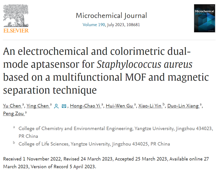 近日,陈颖教授课题组设计合成了一种兼具生物识别、电化学和催化功能的智能核酸功能化金属有机框架复合纳米材料,并将其应用于金黄色葡萄球菌的传感检测研究中。相关研究成果于2023年3月27日以题为“An electrochemical and colorimetric dual-mode aptasensor for Staphylococcus aureus based on a multifunctional MOF and magnetic separation technique”的学术论文发表在分析化学领域国际期刊《Microchemical Journal》上。该文第一作者为yl23411永利(集团)有限公司官网本科生陈宇,通讯作者为陈颖教授。