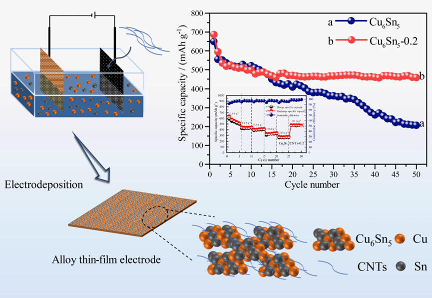 近日,《矿物冶金与材料学报》(Int. J. Miner. Metall. Mater.)发表了yl23411永利(集团)有限公司官网肖围教授课题组的最新研究成果。利用废弃印刷线路板Cu-Sn浸出液作为电沉积液,通过原位电沉积法成功制备了无粘结剂的铜锡合金/碳纳米管(Cu6Sn5/CNTs)合金薄膜电极,系统探究了电沉积液中碳纳米管(CNTs)的浓度对合金薄膜电极的影响。与传统电极制备工艺不同的是,此合金薄膜电极不需要额外添加导电剂和粘结剂便可牢固的附着在集流体铜箔上,可以进一步提升电池的体积能量密度,实现了废弃印刷线路板的资源化利用。
