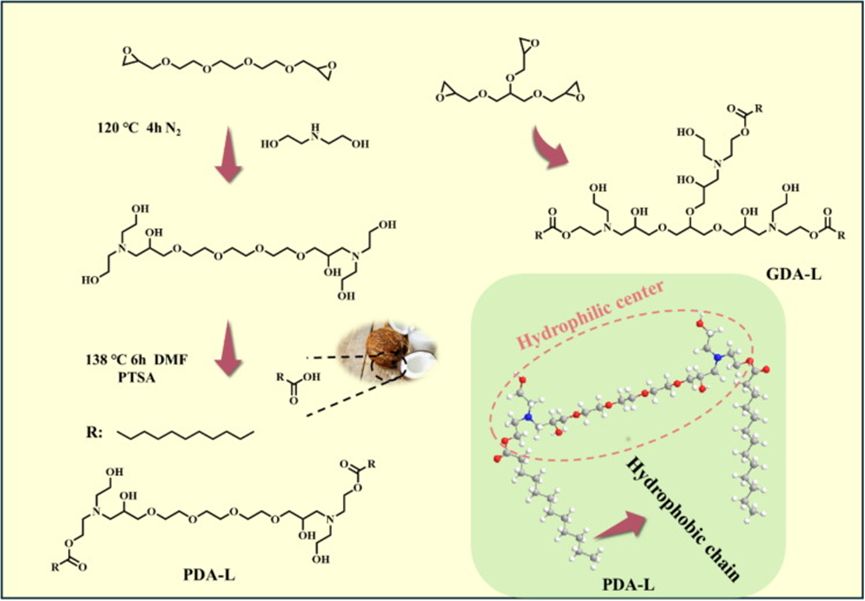 化学破乳因其工艺过程简单,处理效率高,是目前油水乳液分离的主要手段。目前主要的商业破乳剂仍然以环氧乙烷和环氧丙烷为主要原料,存在生产成本高,生产过程危险复杂,而且耐盐耐酸碱能力较差等问题。在本研究中,采用聚乙二醇二缩水甘油醚或甘油三缩水甘油醚与月桂酸反应合成了两种新型破乳剂(PDA-L和GDA-L)。在不添加其它破乳辅剂的情况下,PDA-L和GDA-L在50℃的破乳效率(DE)分别达到了98.98%和92.17%。此外,这两种破乳剂具有优良的耐酸碱能力和强的耐盐能力。与现有的商业破乳剂相比,本研究合成的破乳剂具有以下优势:首先,破乳剂的合成过程非常简单,避免使用危险的环氧乙烷和环氧丙烷为原料;其次,主要原料月桂酸来源于天然产物,具有广泛的来源且经济环保;第三,这些破乳剂能够适应高盐环境,并表现出优异的破乳性能。