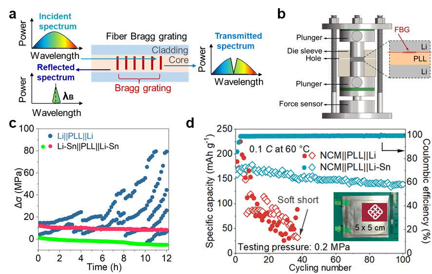 近日,长江大学yl23411永利(集团)有限公司官网李国成博士在材料科学领域取得重要研究进展,其成果" Decoding Chemo-Mechanical Failure Mechanisms of Solid-State Lithium Metal Battery Under Low Stack Pressure via Optical Fiber Sensors "发表于国际顶级学术期刊《Advanced Materials》(IF=27.4,Nature Index收录期刊,中科院一区TOP)。该研究创新性地采用布拉格光纤光栅(FBG)传感技术,首次实现全固态锂金属对称电池界面应力场分布的原位动态监测,成功解耦了低轴向压力工况下化学-机械多场耦合作用诱发的电池失效机制。此项工作开创了固态电池界面力学行为原位表征新范式,为高精度光学传感技术在新型储能器件失效分析中的工程化应用开辟了创新路径。李国成博士为论文第一作者,长江大学为论文通讯单位之一。 内容简述: 基于陶瓷-聚合物复合固态电解质的全固态锂金属电池展现出优异的储能应用前景,但其仍面临界面恶化与锂枝晶渗透等关键挑战,上述问题在低轴向压力工况下尤为严重。揭示其化学-机械耦合失效机理具有重大科学价值。本研究通过嵌入式光纤传感技术实时监测界面应力的演变与分布特征,阐明了其化学-力学耦合演化规律。研究发现,锂金属电极的不均匀溶出/沉积行为会引发界面应力的快速累积与空间异质性增长,进而加剧界面接触失效并诱发锂枝晶成核,引起电池短路失效。基于此,本工作构筑了三维锂/锂锡合金复合负极,发现该结构在低轴向压力条件下仍维持均匀的应力分布特征,实现了电化学性能的显著提升。本工作不仅构建了界面应力均匀性的原位定量表征方法体系,更为揭示全固态电池化学-力学失效机制提供了理论支撑,对高安全性固态电池体系开发具有指导意义。 该研究工作得到了香港理工大学深空探测研究项目(1-BBDC)、国家自然科学基金(52207230 和 92372109)、广州-香港联合基金项目(2023A03J0003 和2023A03J0103))等项目的支持。 图文摘要: 图(a)光纤光栅传感器工作原理示意图;(b)带有植入式光纤光栅传感器和外部压力传感器的改进型Swagelok电池示意图; (c)纯Li和Li-Sn固态对称电池前三次循环过程中的应力-时间曲线图;(d)固态软包电池的循环性能对比图。 文章链接:https://advanced.onlinelibrary.wiley.com/doi/full/10.1002/adma.202417770